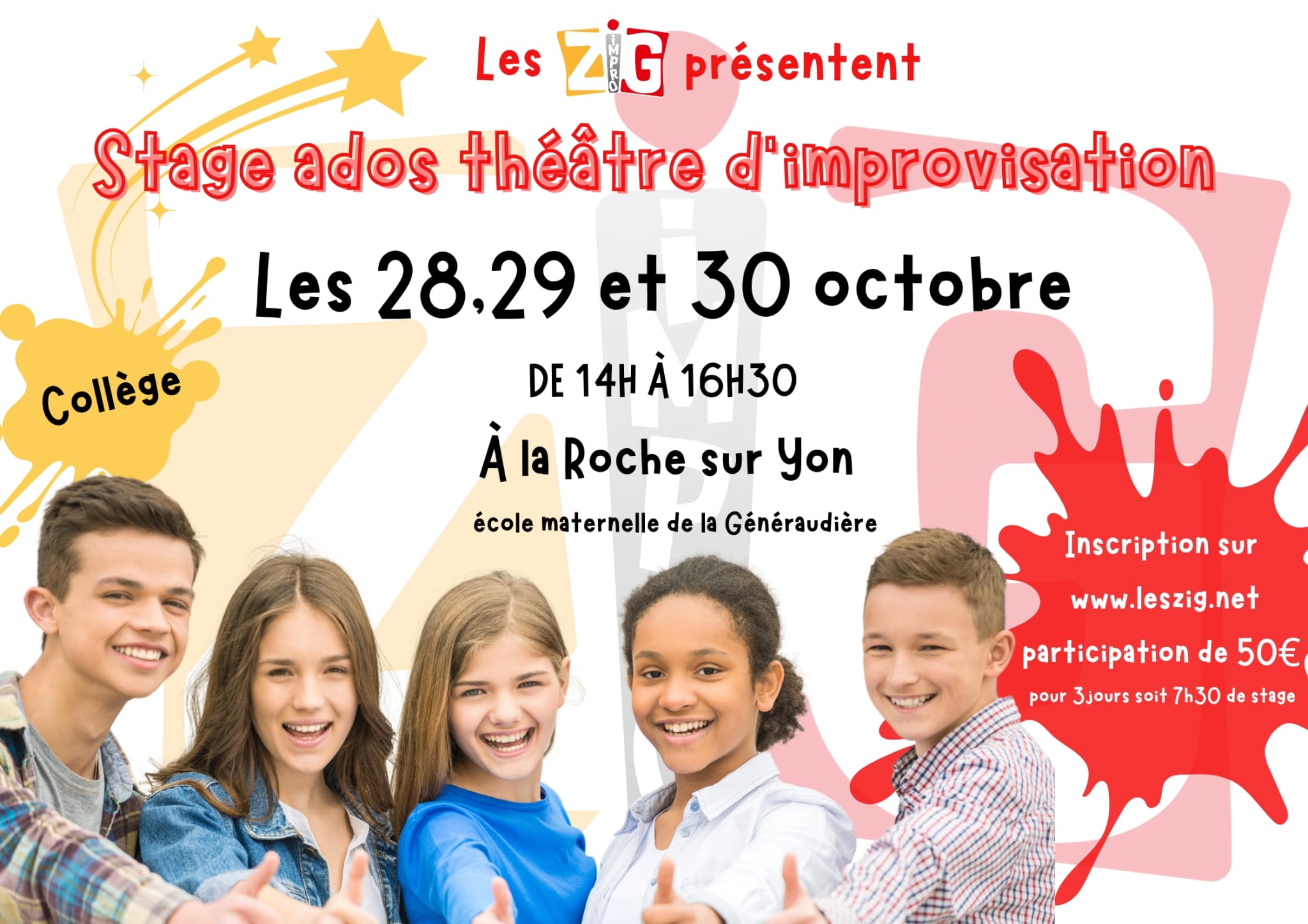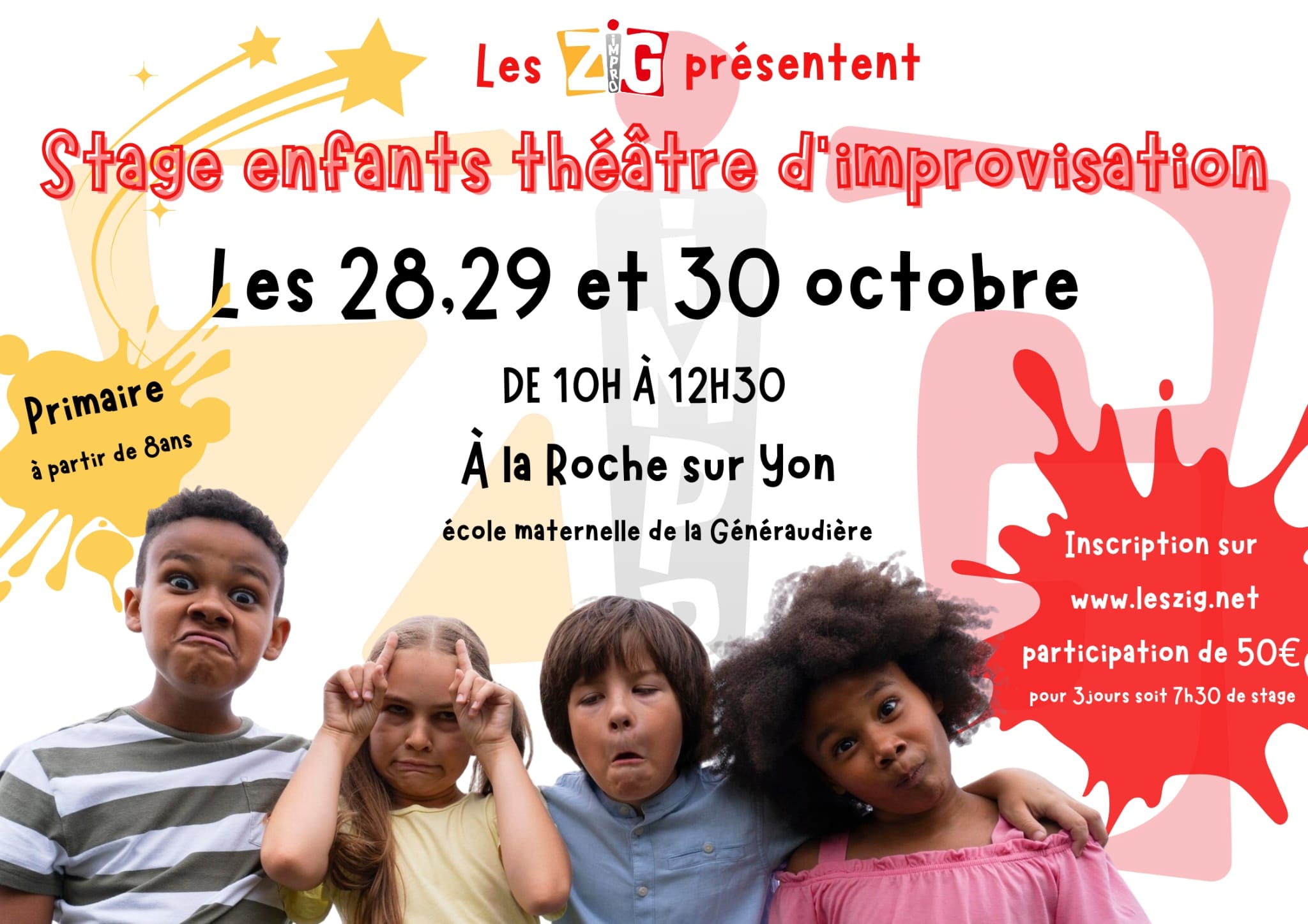 Le Stage impro Enfants/Ados reprend les 28-29-30 octobre Pensez à réserver Prochain match d’improvisation. les ZIG reçoivent l’Assoc Bolo d’Ancenis.